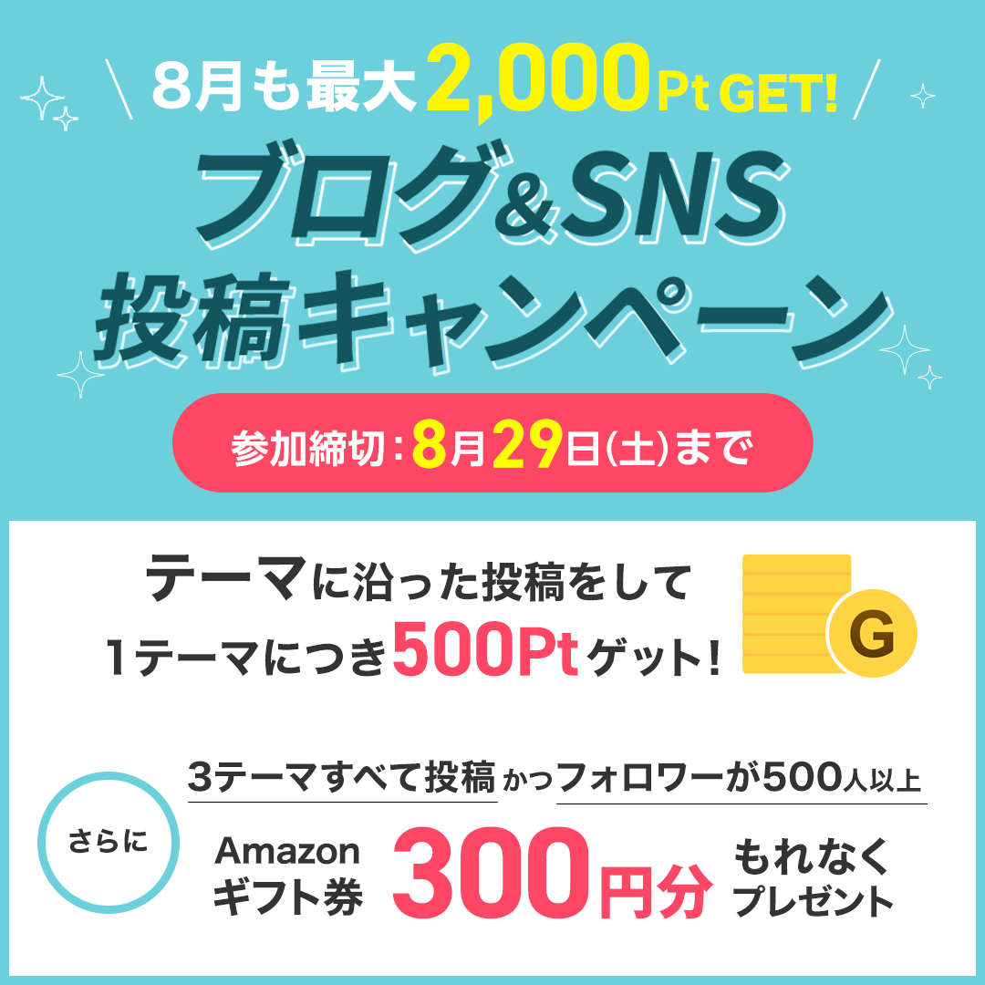 ブログ・Instagram・Twitterに指定のテーマで投稿すると最大2,000pt、さらにInstagram限定でAmazonギフト券300円分がもらえるというお得なキャンペーンです。
