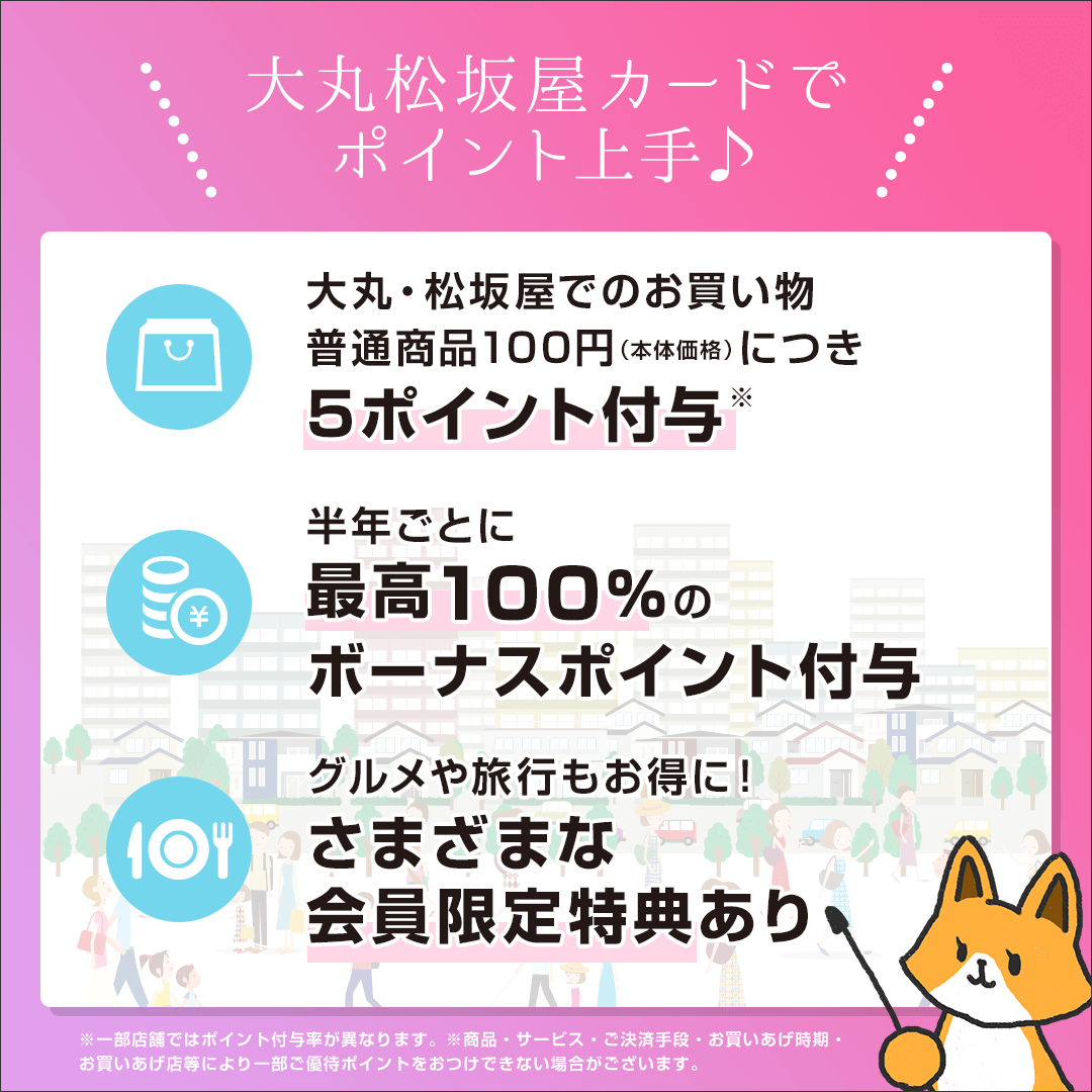 大丸・松坂屋で- 普通商品を購入すると100円(本体価格)につき5ポイント付与。