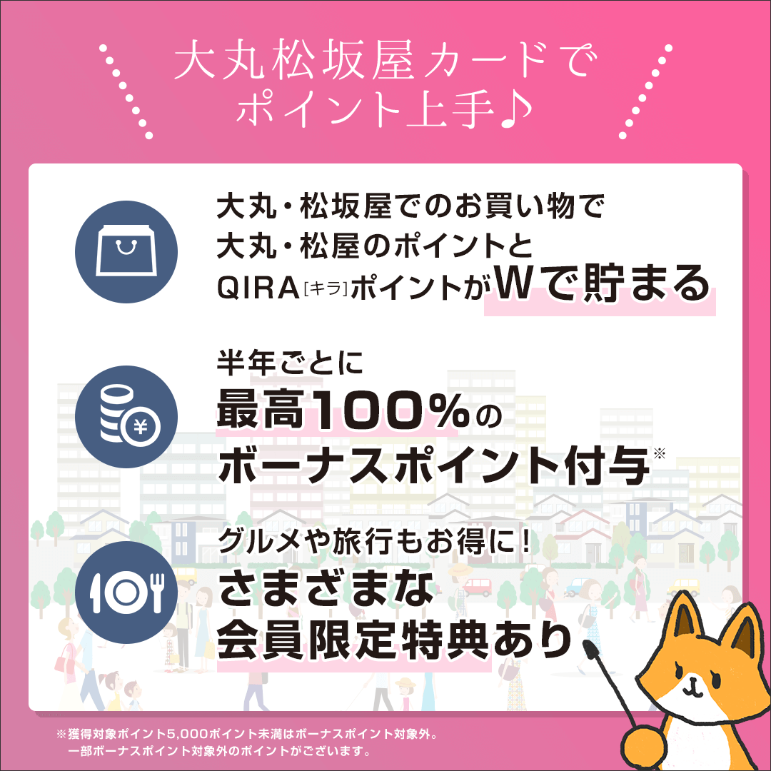 - 大丸・松坂屋での利用で大丸・松坂屋ポイントとQIRAポイント、2つのポイントが貯まります。