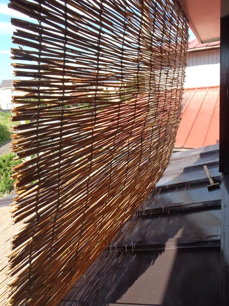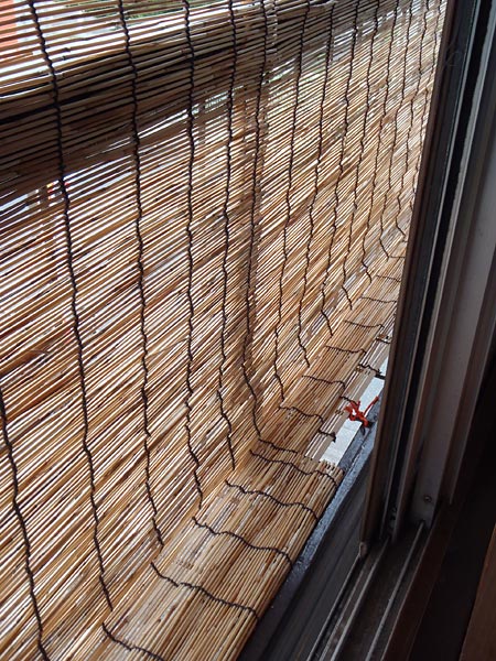 西側は、88cm×157cmのすだれを二枚、雨除けの庇から横に並べて吊るして、窓全体をすだれで覆っています。