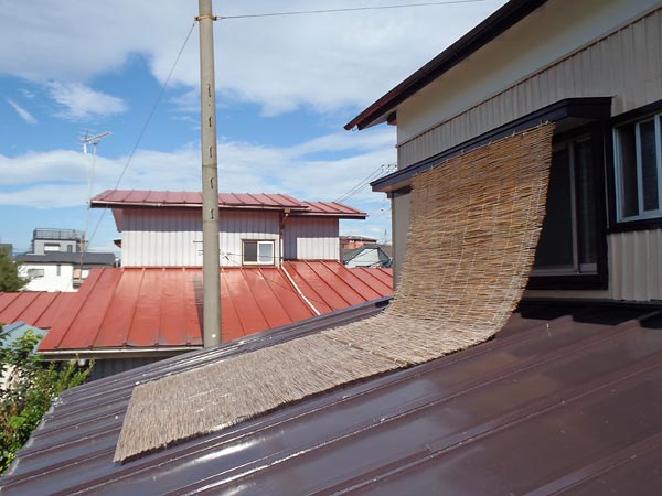 その対策として、180cm×180cmくらいの大きなすだれを縦につなぎ、これを雨除けの庇から垂らし、一階の屋根もろとも覆っています。