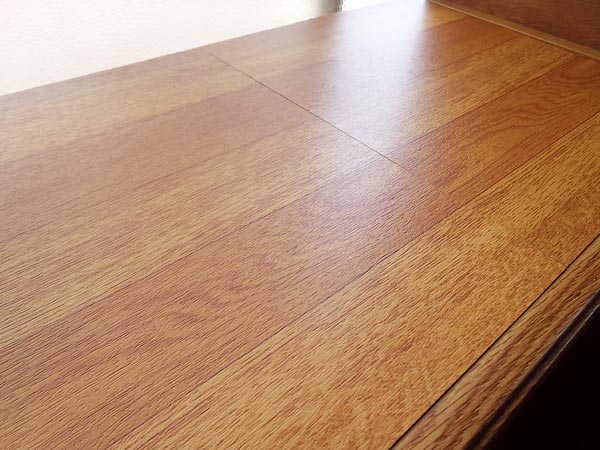 天板は袋状になっているので『裏に穴をあけて裏から押し出して接着しフローリング調の壁紙を……』『いっそのこと天板を剥がして新しい板をはって……』などあれこれ考えたが、手間や金がかかるので『100円ショップのフローリングマットを上に貼る』という一番楽で安い方法にした。