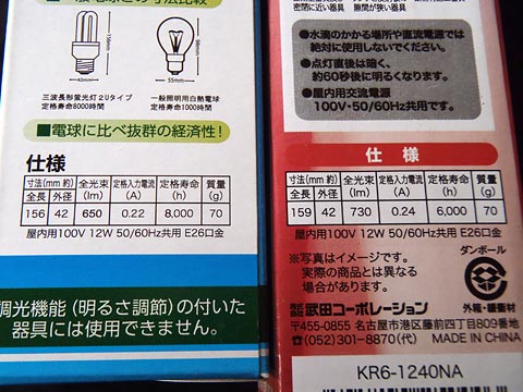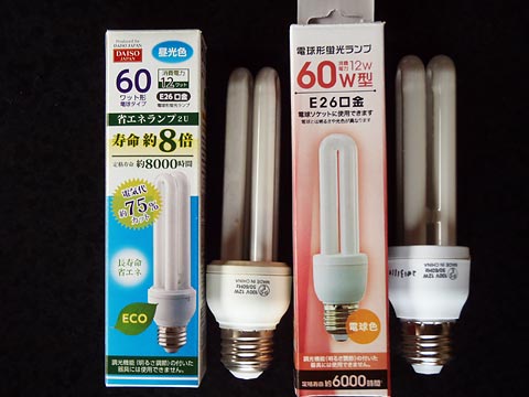 電球型蛍光灯自体が、白熱電球より暗いかというとそうでもなく、パナソニックのスパイラルタイプ60W電球型蛍光灯は、白熱電球と同じか、それよりも明るいくらいですので、100円ショップのものが暗いようです。