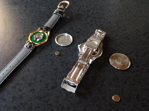 右の大きめの電池はSR916SWですが、この時計は当面使わないので電池は買ってきませんでした。