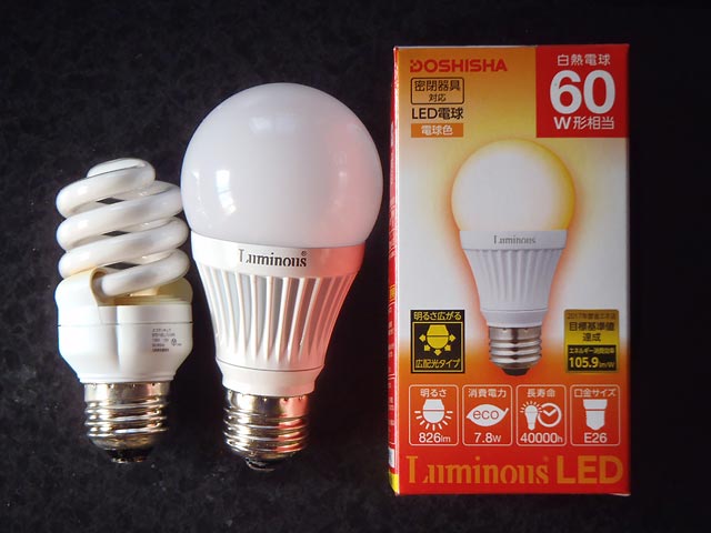 DOSHISHA(ドウシシャ) LED電球 Luminous(ルミナス)LED 60W形 電球色 CJ-A60G-LとOHM電球型蛍光灯EFD15EL/12-SPN。