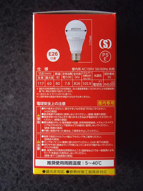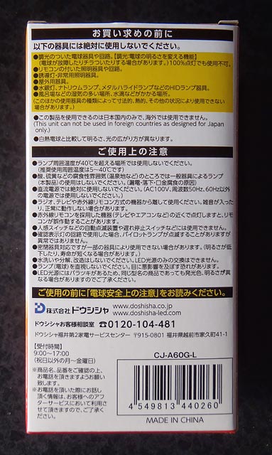 Luminous(ルミナス)LED CJ-A60G-Lの注意書き。
