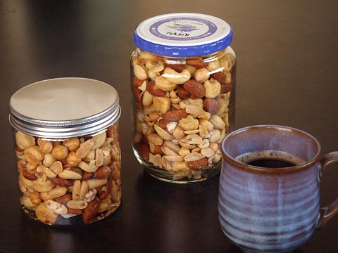 100円ショップ「セリア」で買った550mlだと500gのミックスナッツは入りきらず、800gのジャムの瓶にも入れて、ぴったりの量でした。