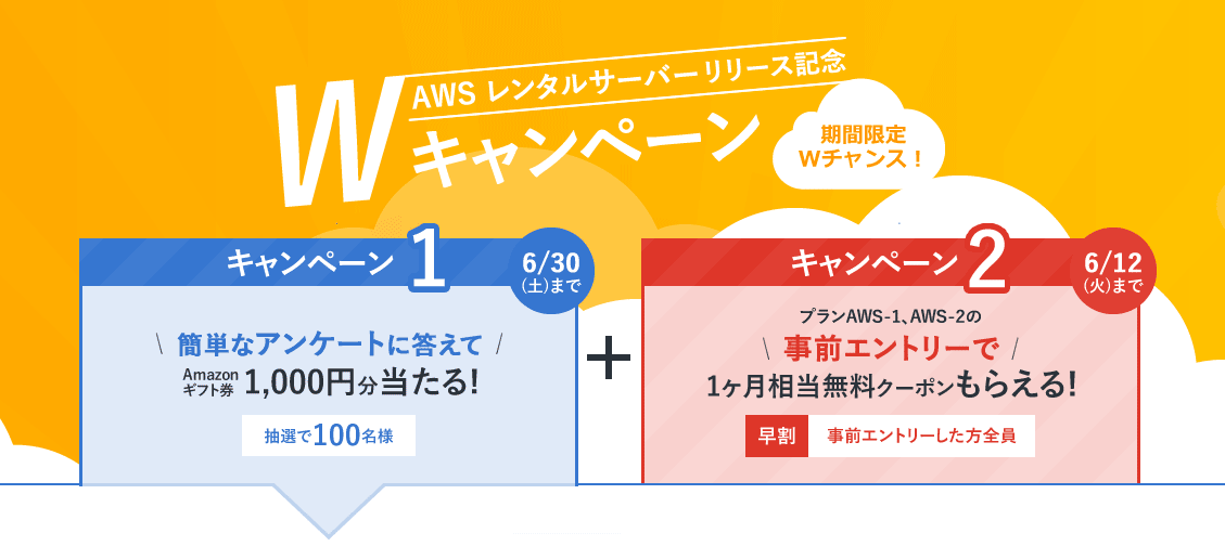 現在、プランAWS-1、AWS-2の提供開始までの期間に事前エントリーをした全ての方に、「AWSレンタルサーバー」の利用料金から月額費用1ヶ月分相当を割り引くクーポンをプレゼント中です。