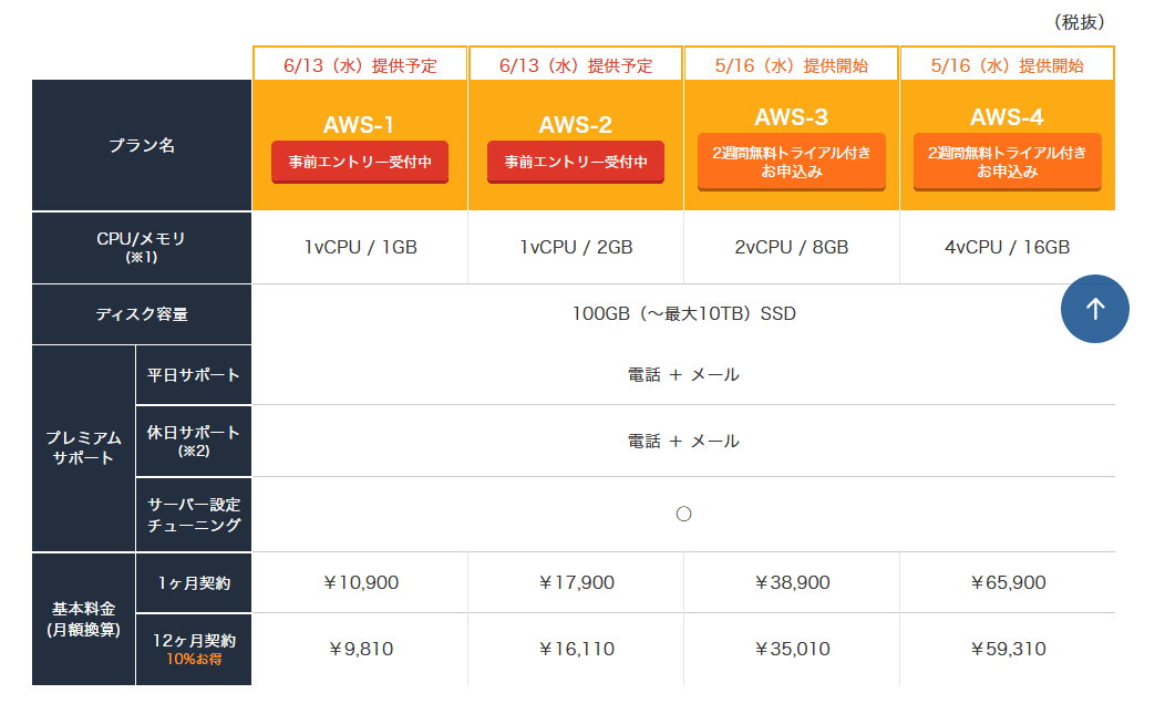 一番安いAWS-1プランが1vCPU/1GB・100GB SSDが9,810円/月(12ヶ月契約)から提供されています。
